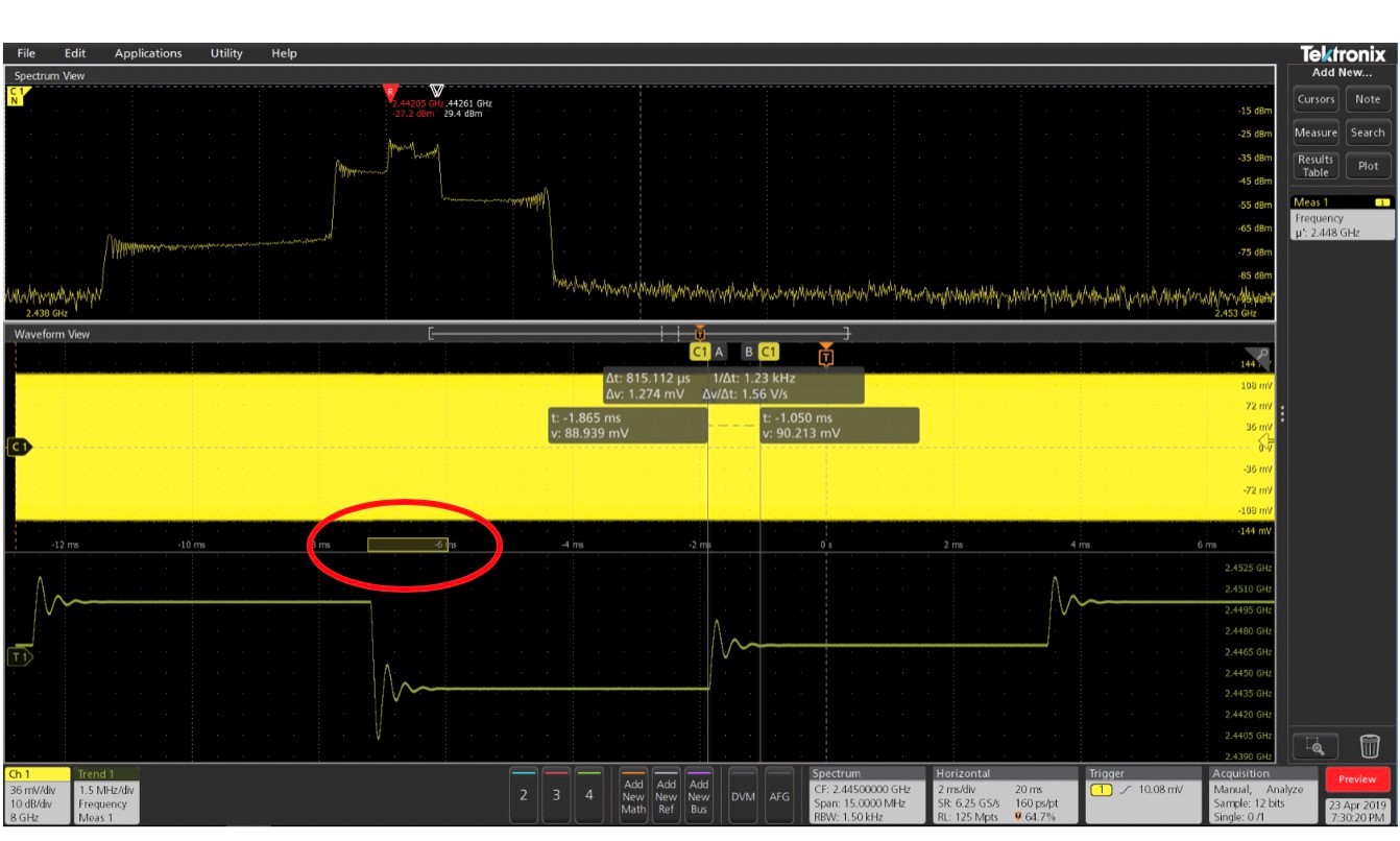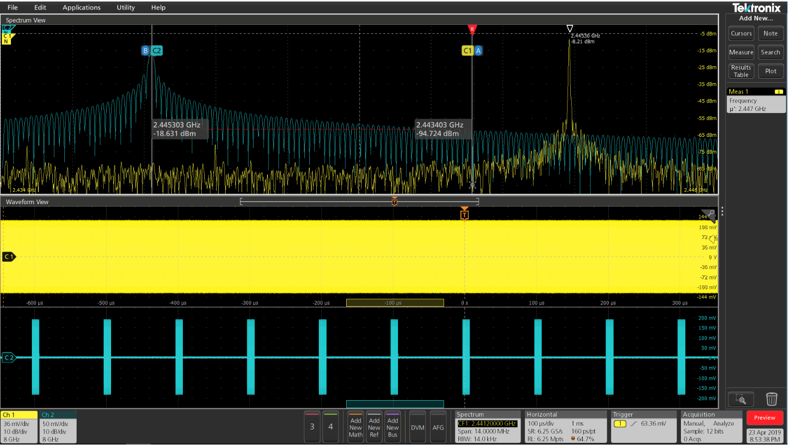 你说,FFT让你备受折磨。我说,有了MSO 4和Spectrum View,你还怕什么?快速傅里叶变换 (fast Fourier transform) 简称FFT, 是利用计算机计算离散傅里叶变换(DFT)的高效、快速计算方法的统称。快速傅里叶变换是1965年由J.W.库利和T.W.图基提出的。采用这种算法能使计算机计算离散傅里叶变换所需要的乘法次数大为减少,特别是被变换的抽样点数N越多,FFT算法计算量的节省就越显著。 一直以来,我们接受的教育就是要用FFT来进行频域信号的测试与分析。工作以后我们利用示波器上的FFT功能进行频域信号测试。FFT功能在示波器普及率高,易获取。可以实现时域、频域联调功能,还具备高采样带宽。 随着测试要求与测试信号的复杂程度的提高,在利用FFT进行频谱分析时,遇到了很多问题。 - FFT测试需要通过调整水平时基来改变RBW,在要求RBW很小的测试场景,需要增大水平时基,严重影响了示波器处理速度; - 操作不直观; - 无法在时域频域同时获得最优的信号呈现; - 动态范围有限; - …… “我在高分辨率的情况下,观测更高频率的信号时会发现,采样率提高,导致采样时间受限,无法捕获其它感兴趣的信号/事件。同时导致波形存储变长,响应变慢;FFT输入样点变多也会严重影响响应速度;需要手动控制采样深度,采样率等等;很难用频谱缩放展示频谱范围。” 这些问题都让我越发头疼,如何才能解决这些问题呢? 泰克新推出的4系列MSO示波器的Spectrum View功能可以完美解决这些问题! - 专利采样技术使得时域频域控制互不干扰,比传统FFT更易用 - 可以在两个域同时从不同角度观测信号 - 观测频域信号在时间轴上的变化 - 分析信号/事件在频域和时域上发生时的相关性 多通道分析测试频谱应用过程中,Spectrum View与频谱仪FFT模式下的数据处理过程相同,虽然测试动态不如频谱仪,但是Spectrum View有着自己的优势,比如可以测试极低频率的信号,具有丰富灵活的探测方式,以及时频分析的相关性。此外,Spectrum View还支持多通道频谱测试,这得益于TEK049支持同时对每个通道的信号作频谱分析处理。 TEK049的多通道时域波形显示方式,所激活的频谱既可以“堆栈 (Stacked) ”显示,也可以“重叠 (Overlay) ”显示。图1同时观测了两个通道的时域波形及频谱,并且采用了重叠显示,以便于频谱之间的对比。所有通道的频谱共用相同的Span、RBW、FFT Window及Spectrum Time,这一点与时域要求多通道间共用采样率、水平时基及触发类似。尽管如此,各个通道的中心频率可以独立设置,默认是联动的,也可以根据需要设置为不同值。