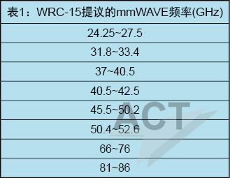 图1. 这三个5G用例是由3GPP和IMT-2020定义的。 增强型移动宽带(eMBB)用例由IMT-2020定义,该用例设想了一个超过10Gbps的峰值数据速率,是4G网络的100倍。经实践证明,数据速率与可用频谱直接相关,而根据香农定理,容量是带宽(即频谱)和信道噪声的函数。低于6GHz的频谱已经分配殆尽,而6GHz以上的频谱,特别是毫米波频率已经成为一个非常有前景的替代方案来实现eMBB用例。但是,哪些毫米波频率会被采用呢? 频谱选项 国际电信联盟(ITU)和3GPP在关于5G标准两个研究阶段的计划上已经达成了一致。第一阶段主要研究低于40GHz的频率,致力于在2018年9月之前解决一些更紧迫的商业需求;第二阶段从2018年开始,到2019年12月,致力于解决IMT-2020提出的关键绩效指标。第二阶段的焦点是高达100GHz的频率。 为了在毫米波频率标准化上达成全球一致,ITU在去年11月举行的世界无线电通信大会(WRC-15)上公布了一个拟定的24GHz~86GHz范围内的全球可行频率列表,如表1所示。国际电联发布该提案不久,美国联邦通信委员会(FCC)于2015年10月21日发布了一条规则制定建议通知(NPRM),推荐了28GHz、37GHz、39GHz和64-71GHz频段的新灵活服务规则(如图2所示)。