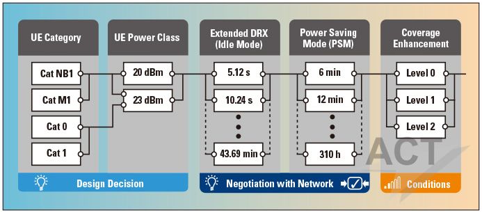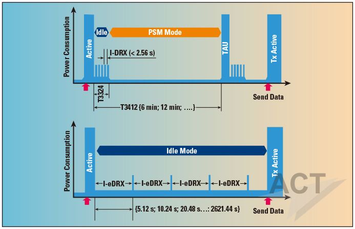 其它特点,例如,降低功耗等,也已经实现。借助eDRX扩展了连接模式或空闲模式中的时隙;调制解调器可以进入接收模式以接收呼叫信息和系统状态信息。DRX定时器决定该操作的出现频率。目前,空闲DRX定时器的最短时间间隔为2.56秒。对于预期每15分钟才接收一次数据且延时要求较宽松的设备来说,该频度已经够高了。 PSM和eDRX间的主要差别在于允许设备驻留在某种掉电模式的时间长度和至接收模式的切换流程。采用PSM模式的设备,必须先进入Active模式,以接收数据,再在空闲模式驻留一段特定长度的时间。采用eDRX的设备可以驻留在空闲模式;无需任何信令,即可快速进入接收模式。 例如,某个设备可能期望收到来自服务器的、频度极小的自发性消息(例如每天一条),但应用要求在不超过10分钟的时间内给出应答。如果该设备采用PSM,则它必须至少以10分钟的间隔时间执行离开PSM模式、完成一次TAU,在空闲模式驻留一段短时间等操作。然而,若使用eDRX,该设备仅需每10分钟进入接收模式一次:这种方式的功耗更小;产生的信令开销更低。对于每天仅发送一次数据、且在除此之外的其它时段无需进行通信的传感器设备,PSM的节电功能可能是最合适的。某些情况下,在连接模式、空闲模式和节电模式中组合运用例如eDRX等的多种节电功能可能更为明智。 值得指出的是,在eMTC和NB-IoT中引入了某些覆盖增强功能,以覆盖例如安装在地窖中的智能电表等应用。其中的一个原理是冗余传输,例如,根据实际覆盖条件在一段时间里重复发送同样的数据。但是,多次发送相同数据显然会占用更长时间,且最终影响总功耗。如图3所示,设计所定义的一组参数会影响设备电池的使用寿命,某些场合下,这些参数取决于网络配置或实际网络条件。