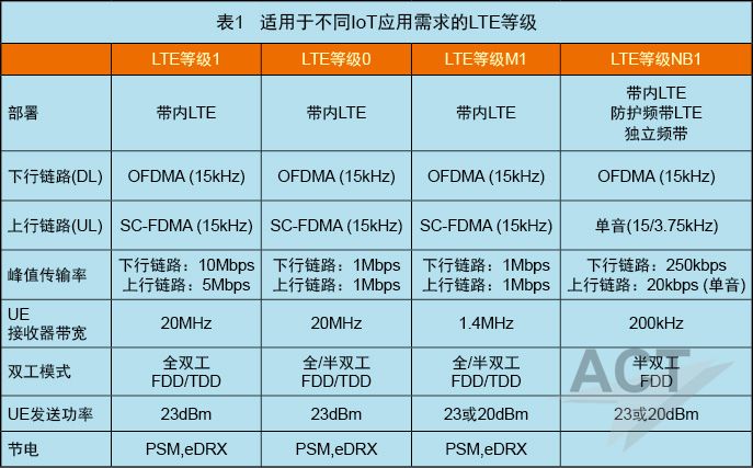 ▲图2 PSM和扩展eDRX 但是,接收器实际上被关机,故通过寻呼操作不能访问到该设备。因此,PSM适用于仅向网络发送少量数据的传感器网络。该模式不适用于要求传感器给出快速响应或者实时性高的应用。使用了PSM的应用,必须容许这种行为特性,且其设计过程必须考虑空闲模式和节电模式最优定时器值的选择。 LTE等级0的引入,其最初意图是显著减小IoT市场中LTE调制解调器的成本。为此,通过将所支持的数据传输率下调至1Mbps减小调制解调器的复杂性。这将处理器和存储器容量等方面的需求降低至最小程度。制造商还可以弃用全双工模式(即同时接收和发送)和多天线设计。其结果是,这类设备不需要双工滤波器。LTE等级0是Rel.13中引入的LTE M1等级的一个过渡性阶段。借助M1等级,推出了其它更多成本削减措施,尤其是减小上行和下行链路的带宽、减小数据传输率和发射功率等。 与LTE M1等级同步推出了名为NB-IoT的新标准。该标准的需求模式包括极低功耗、极低成本、楼宇内增强型接收效果和利用极小数据流量支持大量设备。NB-IoT的带宽仅180kHz,可采用未用LTE带内资源块、相邻LTE载波(保护频带)之间的空闲频谱或独立频谱(例如未用GSM载波中的独立频谱)进行部署。借助NB-IoT,3GPP创建了一种全新的蜂窝空中接口。该接口完全符合典型机器通信的要求。表1简要列出了符合不同IoT应用需求的不同LTE终端等级。