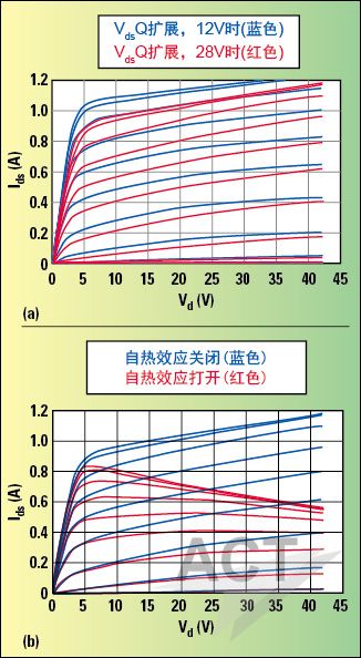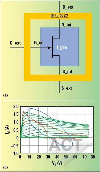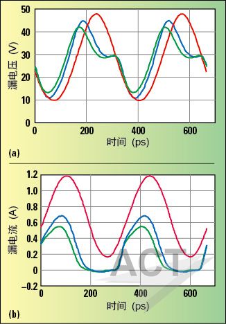 ▲图2 图1模型的静态偏置电压(VdsQ)扩展(a)和自热效应(b)。Vgs范围是-4V至+1V,步进为0.5V。 这些模型还允许设计人员考虑环境和自热效应。图2b显示仿真图1的“自热参数”设置为0(没有自热效应)和1(完全自热,用于静态偏置/CW条件)时的I-V数据情况。和其它高级自定义功能一样,可以通过将自热参数设置为等于占空比,利用0和1之间的中间值估测脉冲信号的近似部分自热效应。可以通过输入模型的“温度”来提供环境温度变量,对于这个模型,这非常适合25至85℃范围内的温度变化数据。此范围可能会根据各个模型的模型信息数据表中的信息而有所变化。 焊线效应消除功能适用于采用带焊线固件开发的裸片模型。这允许用户轻松重建焊线随附模型信息数据表中显示的相同仿真验证,或者消除焊线效应,将模型嵌入到它们自有的独特电路环境中。此功能不适用于封装设备,而是用于可直接进行晶圆探测的裸片模型以及其它裸片模型,后者是在较小裸片尺寸的基础上开发的、基于测量模型的扩展版本。 根据设计人员的反馈,模型库中的所有模型都可访问固有电压和电流节点,以便用于波形分析和优化。图3显示了这一概念。我们的目标是让设计人员访问模型漏极-源极电流生成器层的电压/电流节点,同时消除所有寄生效应。如图3b所示,寄生阻抗会导致仿真动态负载线在I-V层的限制范围之外摆动,甚至可在负电流中摆动;但正确提取的固有波形不会这样。图4显示了仿真固有电压和电流的波形。可以看到A类、B类和AB类电流按照我们通常所期待的那样工作,即全波形A类电流、半波形B类整流等等,但要针对AB类电流提供较小“导通角”6波形。