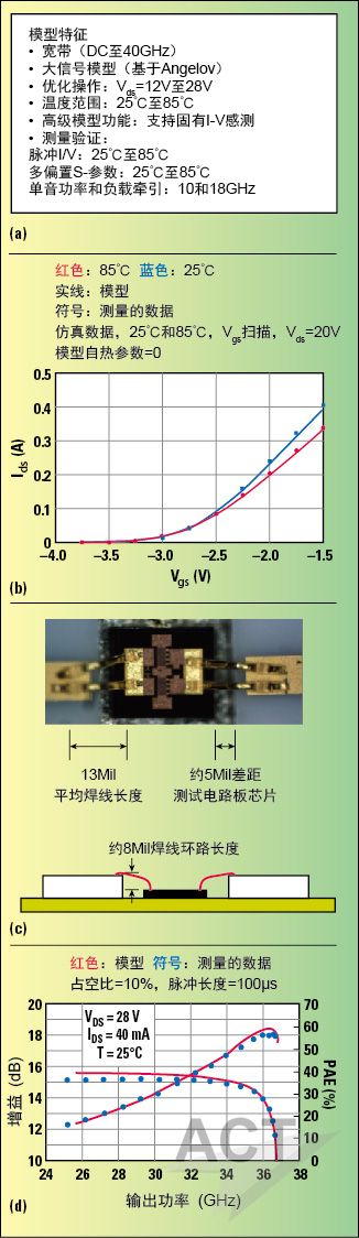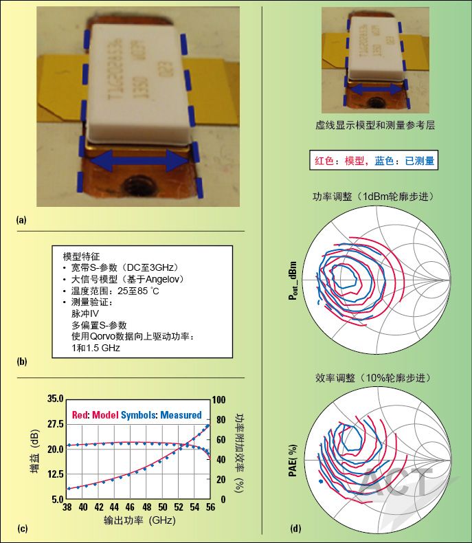 ▲图4 在功率回退情况下,TGF2023-2-01晶体管裸片在A类(红色)、AB类(蓝色)和B类(绿色)偏置下固有参考层的固有电压(a)和电流(b)波形。 器件级验证 上面提到的模型信息数据表是理解模型库中包含的各个模型详细信息的关键。这些详细信息包含模型功能框图、详细的器件级验证,有的还包括采用参考设计的PA电路级验证。数据表通常包含15至20页(或更多)信息。示例器件验证包括电流-电压(I-V)特性、多偏置S-参数、负载牵引数据和Pout/PAE/Gt功率扫描数据的仿真模型与应用测量结果一致。一些器件模型还包括针对噪声参数数据的配置。 图5包含一些数据表中此类信息的快照,有一个最近添加的基于0.15μm技术工艺的GaN裸片器件。如模型功能框图(参见图5a)中的总结,这个特定的Qorvo TGF2935器件模型已经通过了40GHz S-参数验证,并且在大信号负载牵引平台上通过了10和18GHz高功率性能验证。