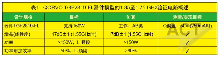 ▲图6 针对Qorvo T1G2028536-FL-001器件的负载牵引和功率向上驱动验证(a)、模型功能框图(b)、带功率调整负载的功率扫描验证(1GHz)(c)、5Ω史密斯图、+35dBm输入功率下的负载牵引(1GHz)(d)。 PA电路级验证 除了上面讨论的器件级模型验证,还要执行功率放大器电路级验证。这里将讨论四个基于仿真的PA参考设计示例,其模型已经用于GaN模型库中的其它模型验证。这些PA设计范围从中等功率到高功率,采用模型库中的多个独特的设备模型,每个模型都为实现一次性成功设计发挥各自的价值。在首次组装后的测试中,所有显示的设计都无需在板调试或偏置调整。 针对此类放大器示例中初始测量和仿真的“闭环”,关注无源匹配和偏置电路建模时的细节信息,与预测这些放大器的频率相关行为的非线性模型一样重要。与电路板相关的差异对于所有表面封装的无源组件(使用时)使用准确的寄生模型同样重要。这些均采用Modelithics CLR Library™模型进行建模。7 表1概述了用于验证Qorvo TGF2819-FL分立式封装GaN产品的Modelithics模型时,首个PA设计示例的目标和结果。组装PA和仿真-测量比较如图7所示。使用模型可“快速转化”高功率、高效率PA的L-频段参考设计,提供超过150W的功率和超过60%的效率。