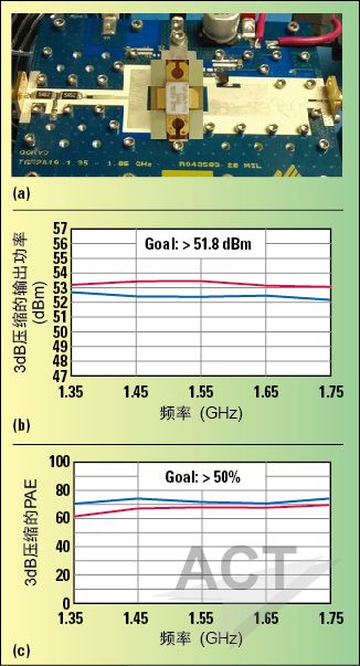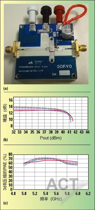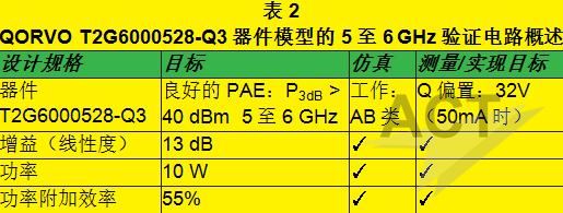 ▲图7 组装TGF2819-FLPA(a),仿真和测量输出功率(b)以及功率附加效率(c)。红色=仿真;蓝色=安装在一个评估板上的五个器件样品的测量平均值 另一个PA验证电路如表2所述,其详细信息显示在图8中,可用于验证Qorvo T2G6000528-Q3 GaN产品。这是一个10W的设计,针对5至6 GHz工作频率,模型测量一致性良好。此设计拥有55%的效率和13dB增益。此外,此示例还通过预测Qorvo的典型器件性能,展示了用于“生产设计”的Modelithics大信号模型的附加值。用于各个放大器的五个器件拥有两年的数据代码差距,这表示它们具有良好的生产一致性。仿真能够预测使用大信号模型的多个放大器的平均性能。