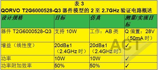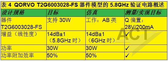 ▲图8 10W、5至6 GHz PA参考设计(a)、5.4GHz时的仿真与测量输出功率(b)以及功率附加效率与频率(c)。实线=仿真,虚线=五个PA的测量值。 表3和图9概述了第三个示例,Qorvo构建的2至2.7 GHz设计可以使用第二个PA示例中的相同器件,生成10W功率、50%效率和20dB增益。表4和图10显示了使用Qorvo T2G6003028-FS封装产品模型的第四个PA验证电路示例的详细信息。这是一个5.8GHz和30W输出功率的窄带设计,可实现50%功率附加效率和14dB增益。除了中心频率略微偏移设计目标之外,仿真和测量结果具有较好的一致性。近期的一篇应用笔记详细讨论了此电路使用Keysight ADS的电路级建模流程8。