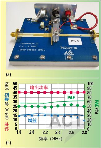▲图9 10W、2至2.7 GHz PA(a)、3dB压缩时的仿真与测量性能(b)。实线=仿真,符号=测量。