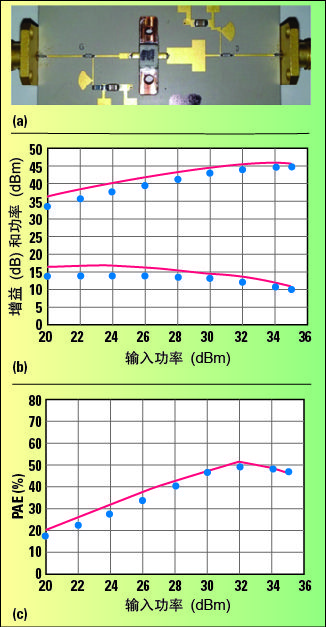 ▲图10 30W、5.8GHz PA(a)8,仿真与测量增益和输出功率(b)以及功率附加效率(c)。实线=仿真,符号=测量。 在所有这四种设计中,由于所用模型的高精度以及制造前进行电路和元件值的ADS仿真和优化,最终实现一次性过关设计。 结论 Qorvo和Modelithics之间的高效合作推进了用于分立式裸片和封装晶体管的广泛GaN模型库的发展。每个模型都有详细论述,并通过了模型信息数据表中所述的丰富的器件级验证。我们已采用一系列功率放大器参考设计来验证实际PA设计模型的实用性和准确性。这项工作显示,全新PA设计模式已经开始充分应用于器件模型并用于构建所有无源网络建模,目标是用仿真和优化来取代“老一代”平台调试,从而实现一次性通过的“仿真-构建-测试-完成”PA设计流程。 致谢 作者感谢Modelithics工程团队的辛勤工作,他们开发并维护Modelithics-Qorvo GaN模型库以及本文中讨论的相关验证。还要感谢Qorvo的Richard Martin和Neil Craig,他们积极协调合作,最终完成了属于Modelithics供应商合作伙伴计划的上述模型库。 参考文献 1. S. C. Cripps, “A Theory for the Prediction of GaAs Load-Pull Power Contours,” IEEE MTT-S International Microwave Symposium Digest, Vol. 1, May 1983, pp. 221–223. 2. L. Dunleavy, C. Baylis II, W. Curtice and R. Connick, “Modeling GaN:Powerful But Challenging,” IEEE Microwave Magazine, Vol. 11, No. 6, October 2010, pp. 82–96. 3. M. Golio, L.Dunleavy and T. Gneiting, “History and State-of-the-Art in Large Signal Modeling for RF/Microwave Power Amplifier Development,” IEEE MTT-S International Microwave Symposium Digest, May 2015, pp. 1–4. 4.P. J. Tasker, “Practical Waveform Engineering,” IEEE Microwave.Magazine, Vol. 10, No. 7, December 2009, pp. 65–76. 5. I. Angelov, H. Zirath and N. Rorsman, “A New Empirical Nonlinear Model for HEMT and MESFET Devices,” IEEE Transactions on Microwave Theory and Techniques, Vol. 40, No. 12, December 1992, pp. 2258–2266. 6. S. C. Cripps, “RF Power Amplifiers for Wireless Communications,” 2nd Edition, Artech House, 2006. 7. “Comprehensive Models for RLC Components to Accelerate PCB Designs,” Microwave Journal, Vol. 47, No. 5, May 2004. 8. “Analysis of a 30 W Power Amplifier Utilizing Modelithics’ Triquint T2G6003028-FS Model in Agilent ADS,” Modelithics Application Note 49, Web. www.modelithics.com. 联系信息 有关 Modelithics-Qorvo GaN模型库的信息,请访问www.modelithics.com/mvp/qorvo(面向Qorvo认证设计人员免费开放)。如果对模型库或PA验证电路有任何疑问,请联系support@modelithics.com。有关Modelithics CLR模型库或Modelithics COMPLETE模型库的信息,请联系sales@modelithics.com或访问www.modelithics.com。