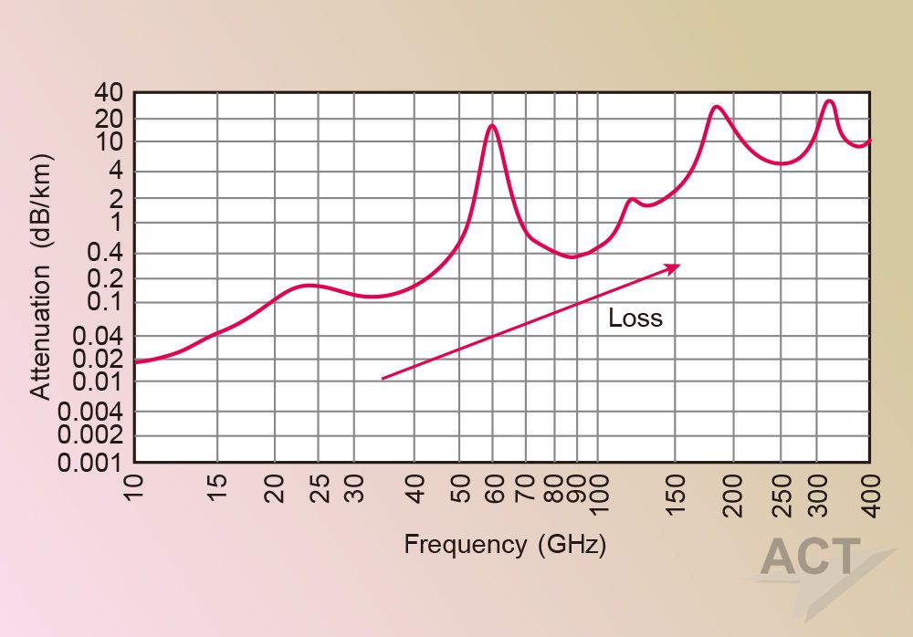 毫米波频率受到大气中尤其是氧气分子的影响,会有比较大的大气传播衰减。图2显示了大气传播衰减和频率之间的关系。在60GHz频段,由于氧气分子对电磁波吸收的加剧,会出现一个衰减的峰值。正因为60GHz传输衰减比较大,传输距离相对短,同频干扰也相对少,因此政府将60GHz频段规定为非授权的频段。同时,衰减较大对测试也带来了挑战,测试仪表需要比较大的输出功率或比较高的接收灵敏度才能保证测试的精度。