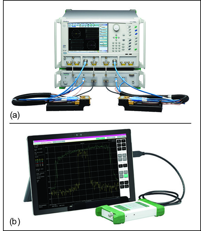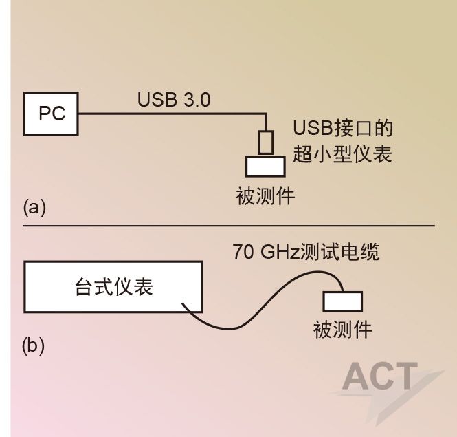 图3、使用超小型USB接口仪表,可以将仪表和被测件直接连接(a);使用台式仪表进行毫米波频段的测试将会面临电缆损耗过大的问题(b)