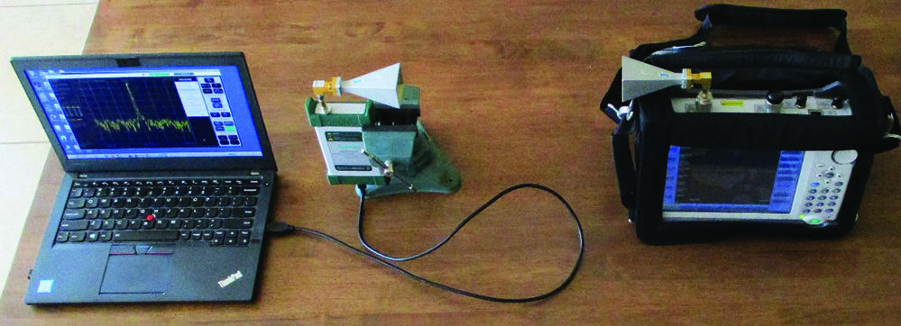 图2、大气传播衰减与频率的关系 当频率到70GHz的时候,同轴连接器内导体的直径只有0.5mm,该尺寸已经接近车床机械加工能力的极限,连接器上任何的毛刺甚至灰尘都会影响连接器在毫米波频段的匹配性能。相对于低频连接器,在使用高频连接器的时候,务必要小心,以免损坏。并且建议在每次使用之前,使用放大镜检查和进行清洁,并且使用力矩扳手进行连接。 应对毫米波测试的挑战 频谱仪是进行毫米波测试的关键设备之一,配合信号源和天线,可以用于无线信道的衰落特性测试。在低频段,常用台式频谱仪和天线组成测试系统。天线一般放置在转台上,台式频谱仪放置在测试台上,两者之间使用同轴线连接。然而在毫米波频段,由于频率的增加,同轴线的损耗会急剧增加。例如,在70GHz频段,一根3m电缆的损耗会高于20dB,使用这样的电缆进行测试时,测量的范围和精度会大大降低。同时,电缆的损耗和相位特性还会随着温度变化,这将导致测试的不确定度增加。为了去除电缆对测试的诸多影响,安立公司提出了全新的方案,使用超小型频谱仪和天线直接连接,便携式的频谱仪使用PC通过USB线进行连接和控制(图3和4)。