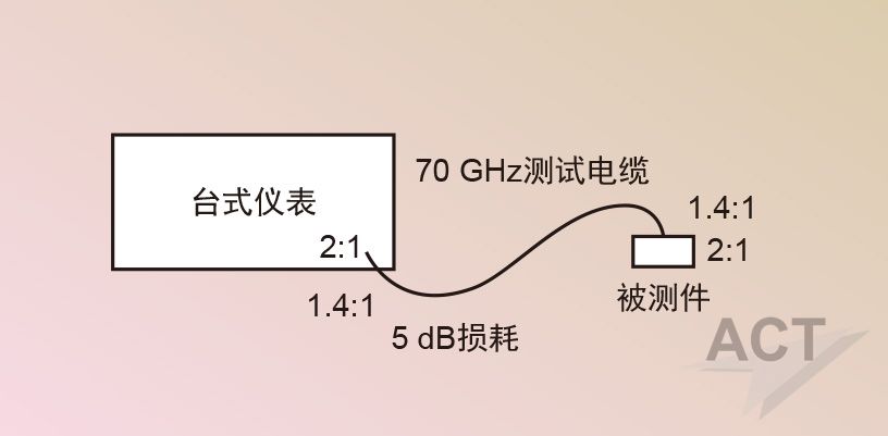 图5、由于连接处的反射ρ1和ρ2导致的测试不确定度(±dB) 使用高性能、低损耗的电缆可以降低测试不确定度,但是会带来成本的上升等问题,例如一根2英尺长的精密测试电缆大约需要1000美元,同时精密的测试电缆也不能完全消除连接端面的失配和电缆自身损耗带来的测试误差(图6)。如果在一个系统中使用多根电缆的话,问题将会变得更加复杂。例如,假设一根电缆在30GHz的损耗是5dB,在70GHz的损耗是8dB,同一厂家生产的另一根电缆,在30GHz的损耗还是5dB,在70GHz的损耗却是10dB。事实上,这种情况很常见,在这种情况下,损耗的计算就变得复杂了,可能需要一个矢量网络分析仪测试每一个频点的实际损耗,这将变得很繁琐并且容易出错。如果能减少甚至消除电缆的使用,将被测件和测试仪表直接连接,将会大大简化测试过程,并且提高测试精度。图6的例子中,如果将频谱仪和被测件直接连接,由于没有了电缆的影响,灵敏度将增加5dB,测试不确定度会降低大约0.4dB。
