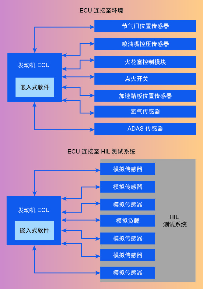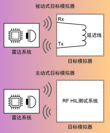 图10. 典型 HIL 测试系统方块图 近年来,RF技术用作关键传感和通信技术的趋势使得很多RF系统工程师开始使用相似的测试方法。在典型的RF HIL测试系统中,相对低速的模数转换器(ADC)和数模转换器(DAC)被替换成了向量信号产生器和分析器。事实上,这些应用中所使用的HIL测试系统在架构上常常跟软件无线电(SDR)类似。不过,很多嵌入式处理元件仍保持相同。RF HIL系统的常见应用包括信道仿真、信道测量、实时GNSS模拟、雷达目标生成和认知测试。 最令人振奋的实时测试应用是车载雷达测试——既包括其作为单独产品,又包括其作为更复杂高级驾驶辅助系统(ADAS)组成的情况。现代ADAS技术结合了雷达(传统上是24GHz波段,现在日益朝77和79GHz波段发展)、摄像机、超声波和LIDAR技术来感测周围环境。ADAS设计的复杂度覆盖了从较为简单的盲点侦测报警指示器到全自动驾驶系统。虽然今天的很多关键汽车传感技术产生的年代都相对较久远了(事实上,首款车载雷达原型可追溯至1950年代末),但传感器尺寸和成本的改进以及信号处理技术的进步已经让自动驾驶系统变得更为可行。 HIL测试用于车载雷达应用 雷达传感器测试需要工程师验证设备的电磁特性和功能特性。例如,典型的RF测量可能包括输出功率和脉冲线性(通过解调FMCW输出进行测量)。同样重要的还有包括测距精度、距离分辨率以及在受干扰情况下检测物体的能力等功能特性。 为了测试物理和功能特性,雷达测试中越来越多地使用既可以配置为测量仪器,又可以配置为雷达目标生成器的测试设备。在本例中,测试系统利用其实时信号处理元件从根本上让雷达传感器相信其看到的一个物体或目标,而实际上只不过是一台测试设备。这个过程,被称为“目标仿真”或“目标生成”,是使用信号处理来重建物体反弹雷达刺激的电磁响应。 图11所示为雷达目标生成的两种方法。第一种方法被称为被动式目标生成法,即使用一根延迟线模拟雷达刺激的来回传播时间。第二种方法被称为主动式目标模拟法,即使用HIL测试系统以数字方式重建雷达系统的环境。在典型的主动式目标模拟器中,由宽带向量信号分析器接收来自雷达传感器的刺激。仪器上载有的嵌入式处理器向模拟距离和多普勒位移施加延迟作用,以模拟速度。最后,由向量信号产生器将这一数字创建的雷达环境生成信号反馈回雷达传感器。