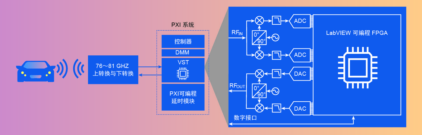 图11. 被动式雷达目标生成器与主动式雷达目标生成器 对于给定的应用,根据所模拟的对象类型,可以选择被动式雷达目标模拟或主动式雷达目标模拟方法。例如,被动式模拟器在模拟短距离目标方面性能更好,而主动式模拟器则可以模拟更为复杂的驾驶场景,如变道或物体穿过马路。 奥迪使用HIL测试助力驾驶测试 NI已经联手多家领先的汽车制造商致力于改进下一代雷达测试技术。例如,在德国奥迪公司着手开发全自动驾驶汽车的开拓性研究工作中,NI最近便与其进行了合作。 奥迪团队认识到,安全和可靠性是新一代自动驾驶汽车的重点。因此,奥迪采用HIL测试在实验室环境下模拟ADAS系统环境。通过在实验室模拟典型的驾驶测试,奥迪实现了在设计过程中提早改进嵌入式软件可靠性,甚至能够发现原本要等到实际驾驶测试时才会暴露的故障。 图12所示的奥迪目标仿真系统结合了NI的第二代向量信号收发器(VST),配有专为79GHz雷达频带设计的上转换器和下转换器。在本场景中,VST起到了软件无线电的功能,且使用LabVIEW可编程FPGA能够为仿真雷达目标执行实时信号处理例行程序。奥迪公司雷达组件负责人Neils Koch博士表示:“PXI VST实现了宽带和低时延软件的结合,使得我们可以在雷达模块中发现原本无法检测到的关键故障。”