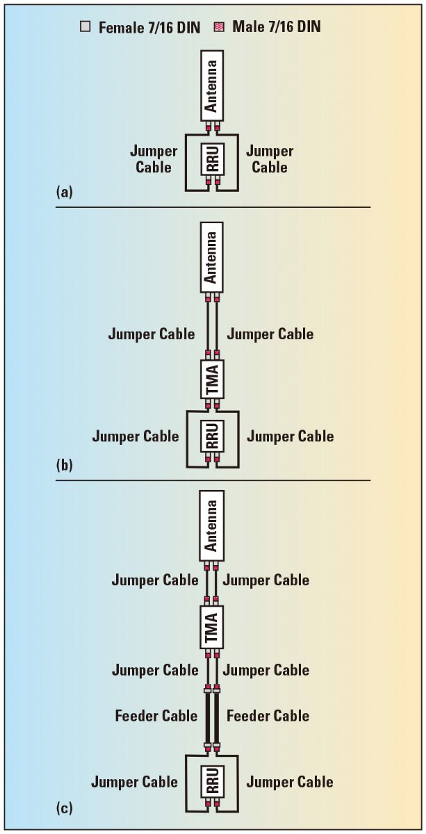 图1. 单扇区2x2 MIMO结构的标准配置:(a)RRU位于塔顶,(b)RRU和TMA均位于塔顶,(c)TMA位于塔顶,RRU位于塔底 通信市场正在追寻越来越高的数据速率,为了满足这一需求,未来几年内无线基础设施会经历多项变革: