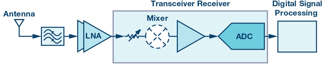 图1.典型分立接收器信号链示意图。 现在我们来比较一个简化的收发器接收信号链。可以看到,收发器接收信号链的物料清单少于类似的分立器件信号链。此外,收发器片内含有两个发射器和两个接收器。看似简单的集成隐藏了接收器设计的精致,后者通常可实现12 dB的噪声系数。图2所示的以下分析说明了系统如何实现高灵敏度。