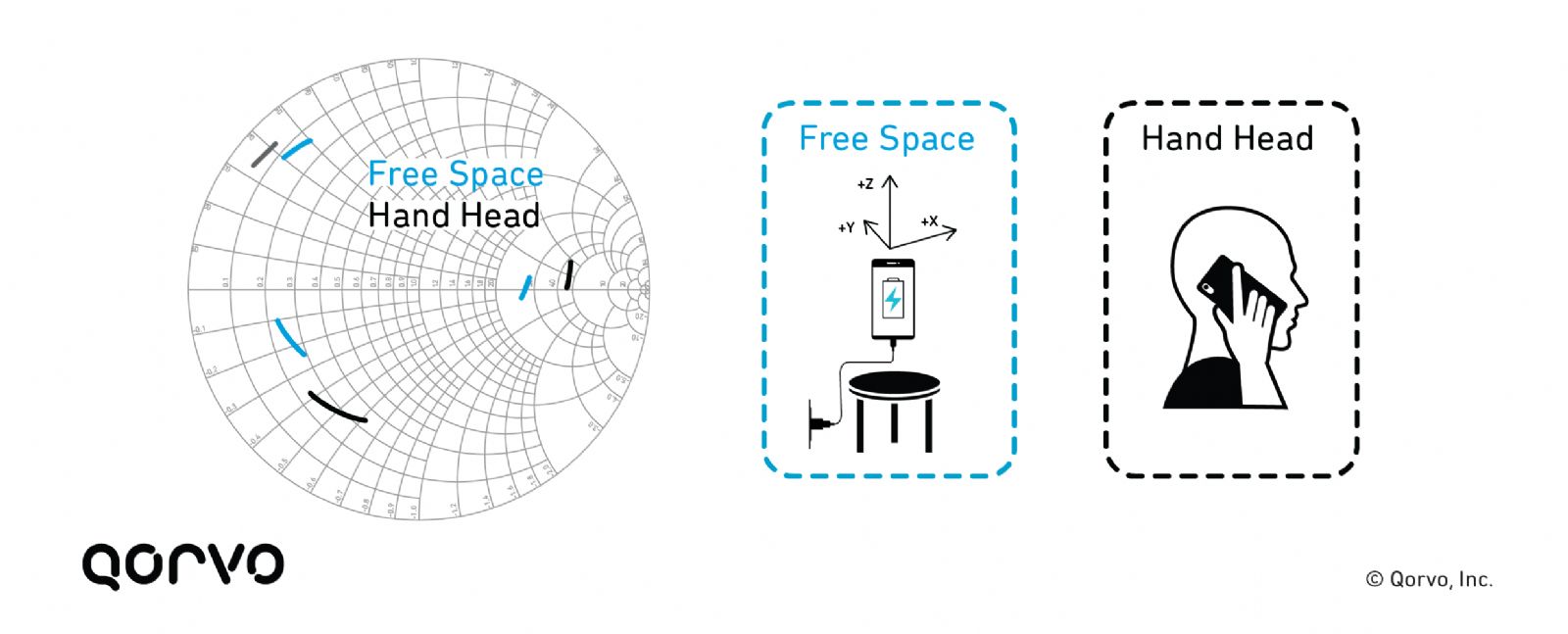 图2:阻抗随频率变化而变化。 天线阻抗在不同使用条件下的动态变化天线阻抗也可能动态变化,取决于握持手机的方式以及手机是否靠近其他物体。手机上的天线通常主要位于手机的底部和顶部。在具有金属外壳的手机中,天线的主要部分位于手机的外部,以最大限度地提高性能。在一般使用条件下,比如当手机放在桌子上、垂直拿着或用于传统音频对话时,这些天线不会受阻,因此能够最大限度实现其性能。但是,在某些情况下,接近不同的材料也可能导致天线阻抗变化,从而降低天线效率,增加手机中的损耗。在严重的情况下,比如手机横握,双手都挡住天线时,天线阻抗会发生很大的变化。