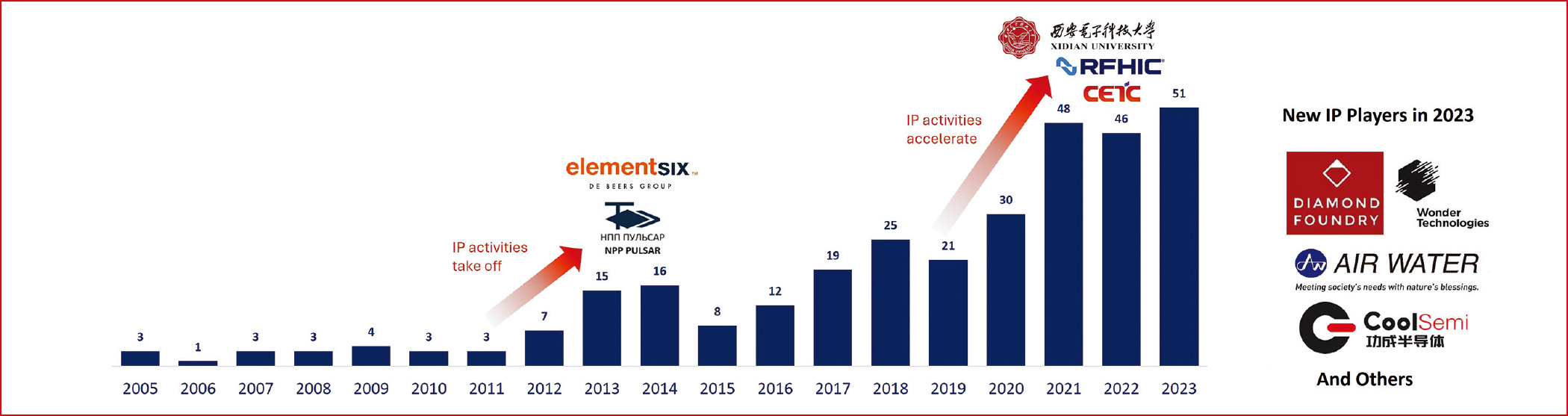 围绕氮化镓和金刚石集成的专利活动 Rémi Comyn,KnowMade 氮化镓电子器件,特别是基于氮化镓的高电子迁移率晶体管(HEMT),正越来越多地应用于射频和功率转换领域。然而,在要求最苛刻的应用中,氮化镓器件的性能和可靠性可能会受到热因素的限制。某些形式的富集单晶合成金刚石在室温下具有已知固体中最高的热导率。1 因此,将金刚石集成到氮化镓电子器件中可以显著改善氮化镓器件的热管理。然而,迄今为止,这种集成在技术上一直充满挑战。2 KnowMade在其最新的氮化镓电子器件分析报告中,根据最近在该领域提交的专利申请,重点介绍了在电子器件中利用氮化镓与金刚石集成的工作。 许多新人进入这一知识产权领域 专利分析的范围很广。它考虑了所有声称将金刚石与氮化镓电子器件集成的专利申请,而不区分材料,因此包括使用单晶金刚石、多晶金刚石和其他种类金刚石的申请。分析并不区分集成金刚石的工艺。这种集成可以是钝化层、基板、散热器或其他用途。分析也没有区分金刚石是以外延、键合还是其他方式集成的。 根据这些指导方针,图1描述了与将金刚石材料与氮化镓集成的技术挑战相关的知识产权(IP)活动的时间演变。如图1所示,在2000年代,专利活动非常少,但在2010年代初,专利活动急剧增加。专利活动增加的推动力是Element Six和Group4 Labs等先驱者的努力。