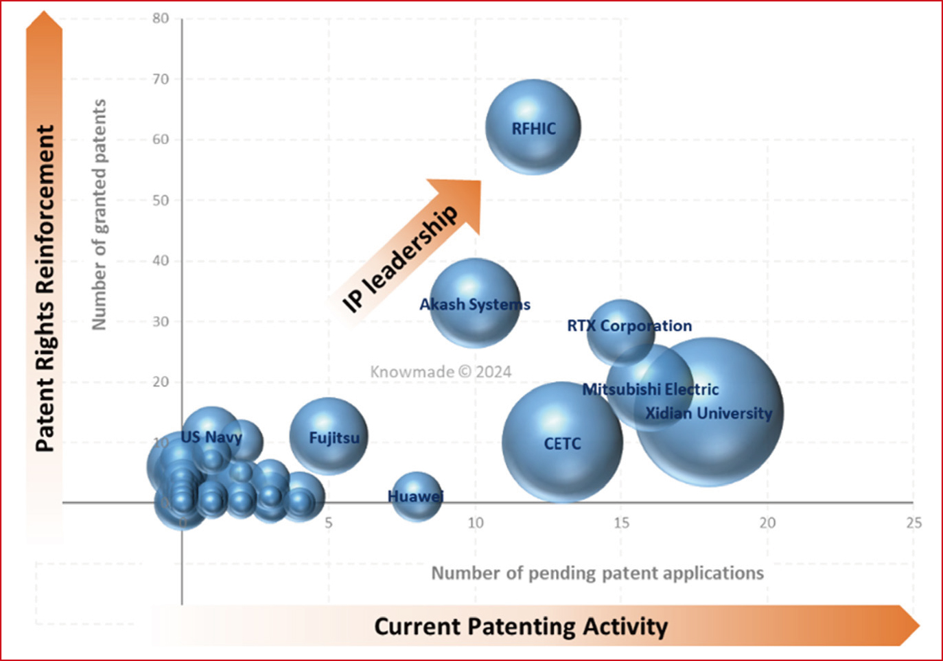 图2:Diamond Foundry的单晶金刚石晶圆专利图 知识产权领先者 通过比较主要专利权人的进行中的专利申请数量和已授权专利数量,可以深入了解特定技术的全球知识产权竞争情况。图3显示了金刚石材料与氮化镓电子器件集成的知识产权情况。图3在x轴上绘制了进行中的专利申请数量,在y轴上绘制了已授权专利数量。在这些指标的交叉点上,气泡的大小代表了研究中所选专利族的数量。图3的结果显示,RFHIC是目前氮化镓和金刚石相关知识产权领域的领先者,但RF GaN市场上的几家公司已将自己定位为挑战者。可以看出,Akash Systems是RFHIC最接近的竞争对手,但在专利申请和专利授权方面略逊一筹。不过,RTX、三菱电机、西安电子科技大学和CETC等公司的专利申请量都超过了RFHIC,未来可能会构成强有力的竞争。此外,三菱电机、西安电子科技大学和CETC拥有的氮化镓和金刚石相关专利家族数量相当或更多。RFHIC目前的知识产权领先地位主要继承自Group4和Element Six的专利活动,尽管RFHIC在2018年专利交易后不久就披露了几项发明。4