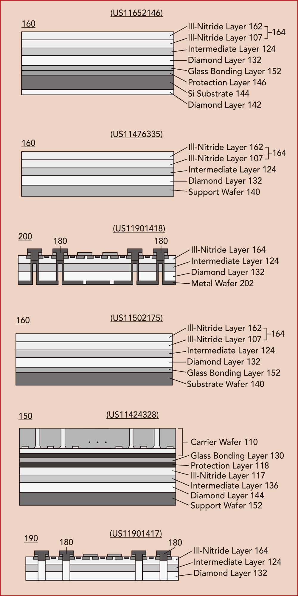 图3:将金刚石集成到GaN的知识产权的发展情况。资料来源:KnowMade。 KnowMade在其2023年氮化镓电子器件知识产权报告中分析了这一领域知识产权的发展情况,并指出RFHIC在金刚石基氮化镓晶圆和外延片方面的知识产权优势,而这正是射频氮化镓供应链的上游环节。在这部分供应链中,除西安电子科技大学外,RFHIC在知识产权方面没有强大的挑战者。由于西安电子科技大学的大部分专利都是最近才申请的,而且都是在中国申请的,因此,尽管中国大学披露的发明数量相对较多,但其在知识产权方面的领先优势仍然有限。相比之下,RFHIC的专利组合保护了其在许多不同国家,尤其是欧洲、日本、美国和韩国,的权利。 有趣的是,RFHIC在2021年恢复了专利活动,公布了七项与金刚石基氮化镓相关的新发明。同时,他们还确认了一项全球知识产权战略,尤其是一项受多项国外专利(包括六项美国专利)保护的发明。该发明涉及通过金刚石层将III-氮化物层从硅生长基底转移到支撑晶圆。该方法的不同方面已通过各种专利申请得到保护。例如,III-氮化物层和金刚石层之间的中间层(US11652146)、硅/金刚石复合支撑晶圆(US11652146)和支撑晶圆的沉积(例如US11476335中的多晶GaN或多晶硅)、载体晶圆(例如US11424328中提到的碳化硅载体)以及在此类工程基板上形成通孔,如专利申请US11901418和US11901417中所述。图4显示了这些专利和RFHIC获得的其他专利中有关氮化镓/金刚石晶圆的图纸。