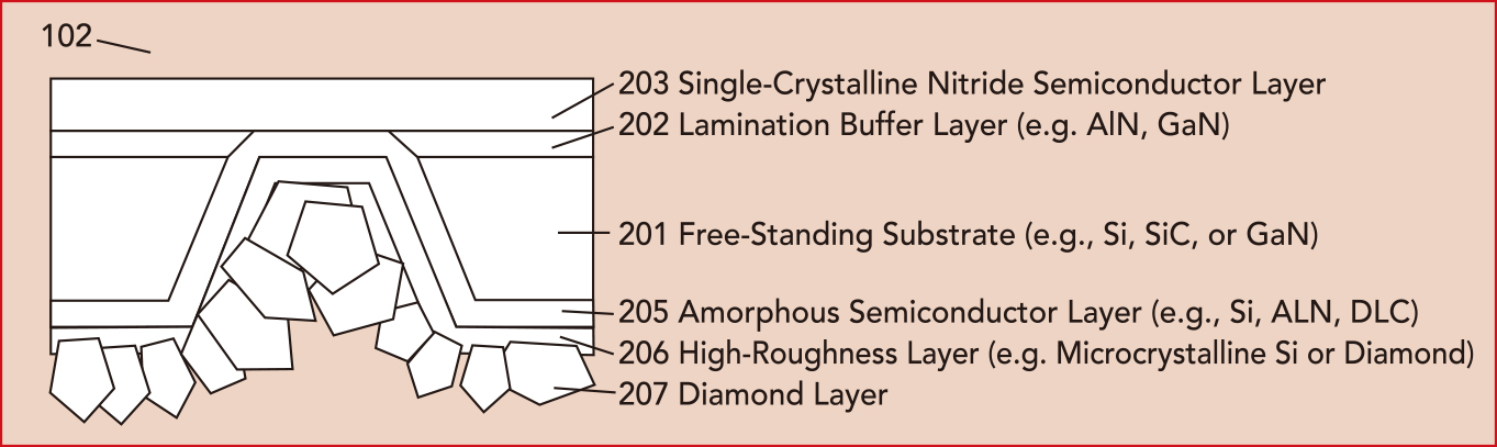 图1:与采用金刚石材料的氮化镓电子器件有关的发明(专利家族)数量。资料来源:KnowMade。 Group4成立于2003年,是一家美国初创公司,2008年与Element Six合作。Group4随后于2013年被Element Six收购。2016年,新成立的Akash Systems与RFHIC达成协议,共同协商回购Element Six的金刚石基氮化镓知识产权。Akash获得了与金刚石基氮化镓技术相关的所有专利和其他知识产权,用于卫星通信和相关市场。 2021年,专利申请数量急剧增加,这主要是由于中国企业的加速发展,如中国电子科技集团公司(CETC)有29项发明,西安电子科技大学有44项发明。自2021年以来,在30多家新的知识产权主体(尤其是武汉大学、深圳大学和太原理工大学等中国研究机构,以及上海功成半导体公司、化合积电(厦门)半导体科技有限公司等中国企业)的加入支持下,专利申请活动相对稳定。 除中国外,日本的Air Water公司与大阪市立大学合作,最近也进入了这一领域。这项合作共同申请了专利WO2023/048160,并于2023年初公布。专利公布后,2023年底又发表了一篇科学论文。3 在这篇论文中,研究人员介绍了一种基于在硅衬底上形成的3C-SiC层上异质外延GaN的方法。然后,移除硅衬底,根据第一项专利权利要求,将氮化镓-3C-SiC叠层键合到导热支撑层上,导热支撑层可以由金刚石或多晶SiC制成。迄今为止,约有30个专利家族公开了基于键合技术将金刚石材料与氮化镓电子器件集成在一起的方法。 然而,氮化镓材料与金刚石衬底的键合在技术上具有挑战性,因此人们开发出了替代方法。例如,成立于2016年、总部位于迪拜的初创公司Wonder CVD于2023年进入氮化镓电子器件专利领域,提交了US20230307249号专利申请。该专利描述了在SOI衬底的硅(111)薄层上生长多晶金刚石,去除基底层和氧化层,然后在硅(111)薄层的另一个表面进行GaN的异质外延。 另一个有趣的例子是欧洲的imec和UHasselt之间的合作,在专利EP4125113中有所描述,尽管该专利申请似乎已于2023年8月放弃。该发明涉及在氮化镓材料和多晶金刚石材料之间形成稳定连接的纳米晶金刚石层。此外,纳米晶金刚石层有望进一步促进氮化镓电子器件的散热。 虽然前面的例子描述了金刚石材料与氮化镓器件层接触或相对接近的集成,但美国初创公司Diamond Foundry在2023年以一种不同的方式进入了氮化镓电子器件专利领域。在专利申请US20230411459中,Diamond Foundry披露了一种金刚石衬底,可用作GaN或SiC器件的封装衬底,以替代电动汽车应用中使用的硅基IGBT芯片。Diamond Foundry是该领域为数不多的以电力应用为目标的公司之一。总体而言,在所有与金刚石集成相关的发明中,明确以电力电子为目标的发明不到10%。图2显示了US20230411459中的一张图纸,说明了Diamond Foundry对其金刚石衬底的想法。
