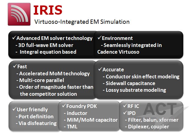 芯禾科技的IPD采用先进的片上无源器件工艺,为客户提供了标准和定制化元件库,可应用于智能手机、物联网等多个领域,该工艺目前被国内最大的IC设计公司和国内最大的晶圆厂广泛使用。 用于RFIC设计的EDA工具集,内嵌基于矩量法的三维全波电磁场仿真器,全面考虑导体趋肤效应、临近效应以及介质损耗等。它与Virtuoso无缝集成,且支持多核分布式并行计算的核心求解器,大大降低EM仿真时间、提高了设计效率。