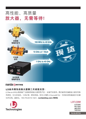 高性能、高质量 放大器,无需等待! 多倍频 低噪声型号 中功率 型号 台式仪器 低噪声型号 L3业内领先的放大器第二天就能交货! L3 Narda-MITEQ 提供最广泛的高性能放大器系列产品 - 全部三年质保。我们最受欢迎的放大器型号备 有现货,可立即发货。今天订购,明天就到。您可以信赖 L3 Narda-MITEQ - 您的射频和微波组件的最 佳供应商。请致电:+86-755-8376-1820。nardamiteq.com/083b 航空系统 电子系统 通信系统 传感系统